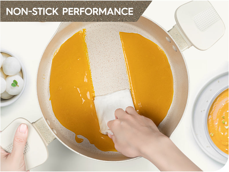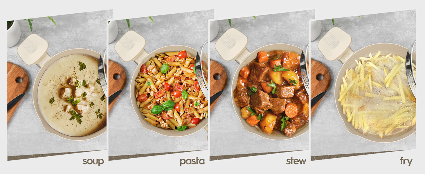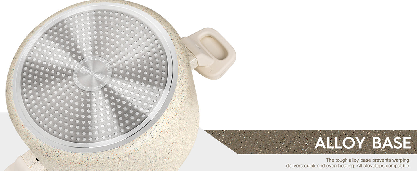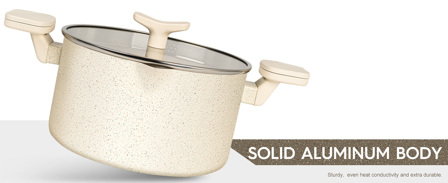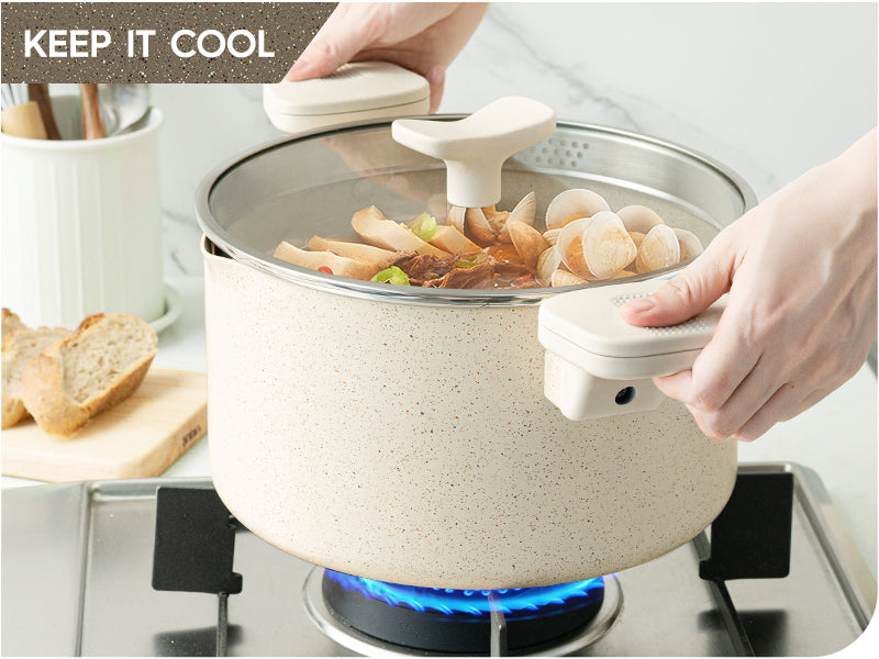 The specially designed handles of this cooking pot are wrapped in soft silicone that stays cool while cooking, is comfortable to touch, and easy to hold.