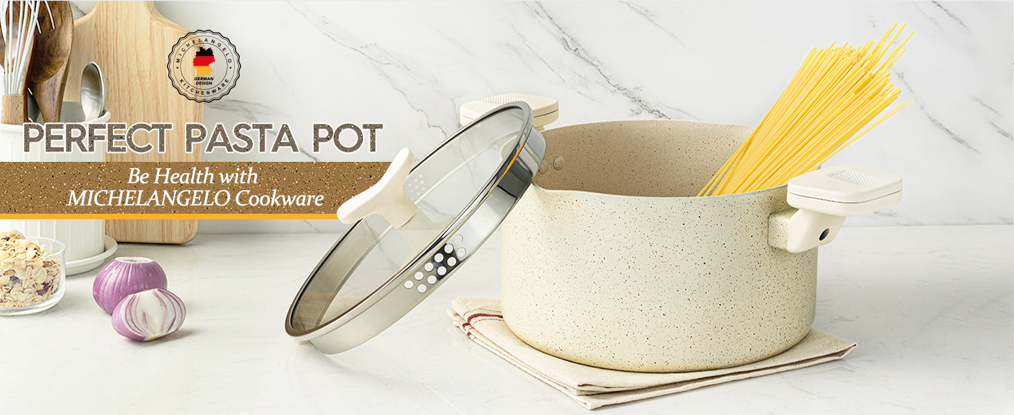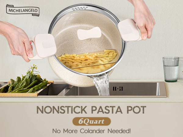MICHELANGELO pasta pot comes with a strainer lid and twist-to-lock handles, just twist the handles then you can easily strain out the water without a strainer.