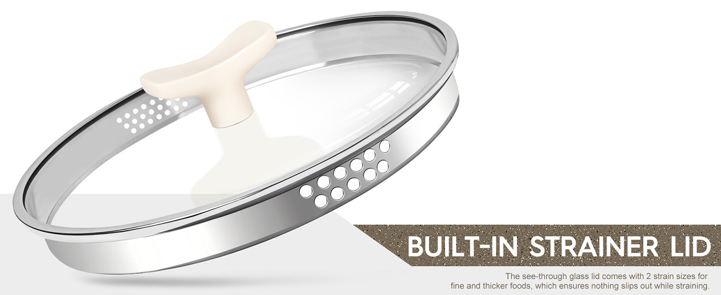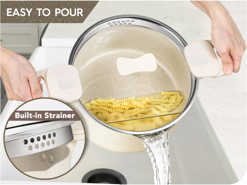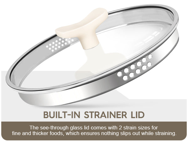 • DRAIN WATER EASILY - This pasta pot features twist-to-lock handles and a strainer lid with 2 straining sizes, so you can easily strain out the water by twisting the handles. No strainer needed!