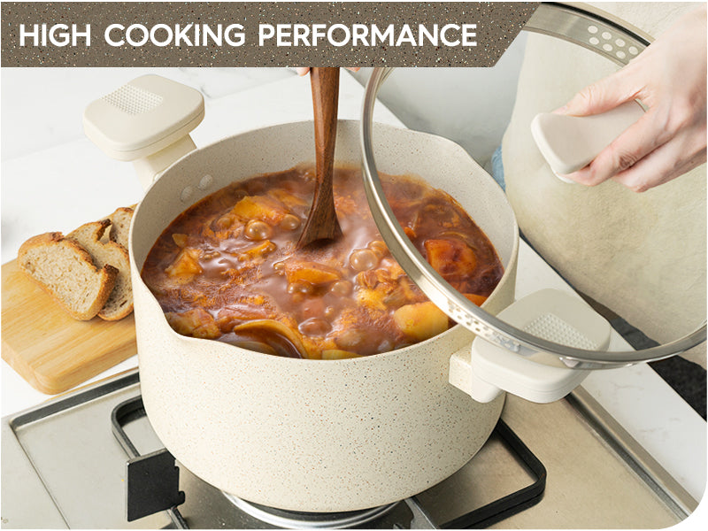 • COMFORTABLE HANDLES - Our nonstick pot comes with ergonomically designed handles that are wrapped in soft silicone that stays cool to the touch and easy to hold.