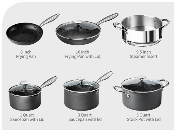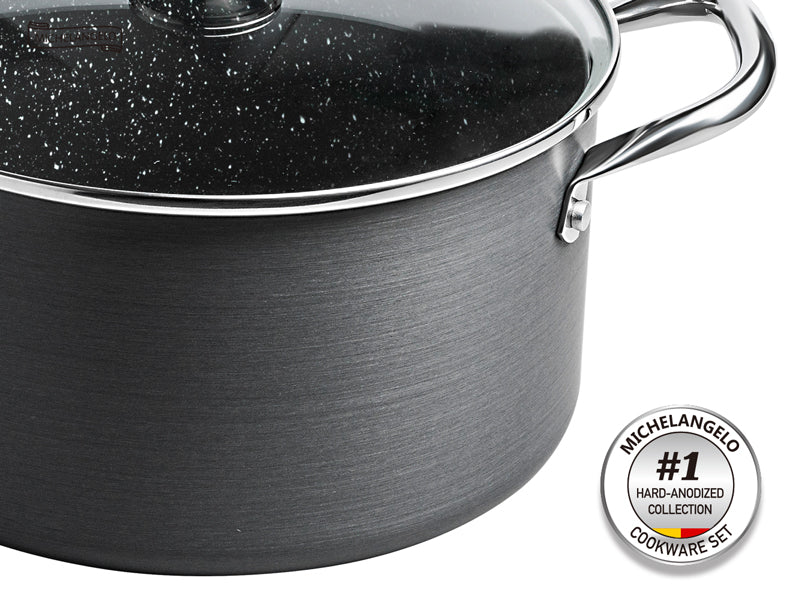 • MEET ALL YOUR NEEDS FOR DAILY COOK - MICHELANGELO 10-piece hard anodized cookware set includes 8 inch nonstick pan, 10 inch fry pan with lid, 1 quart saucepan with lid, 3 quart saucepan with lid, 5 quart stock pot with lid, 9.5 inch steamer insert.