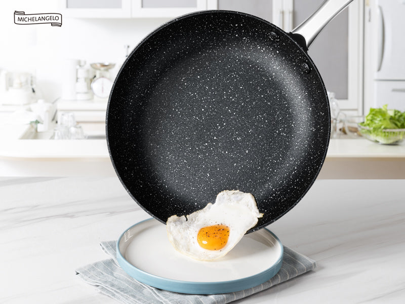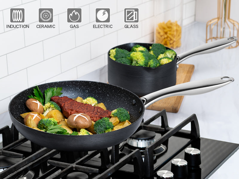These pots and pans are made with a flat alloy bottom that is suitable for all kinds of cooktops, including induction, gas, electric, ceramic, glass, etc. And the professional grade aluminum alloy offers fast and even heating with precise temperature control, no hot spots.