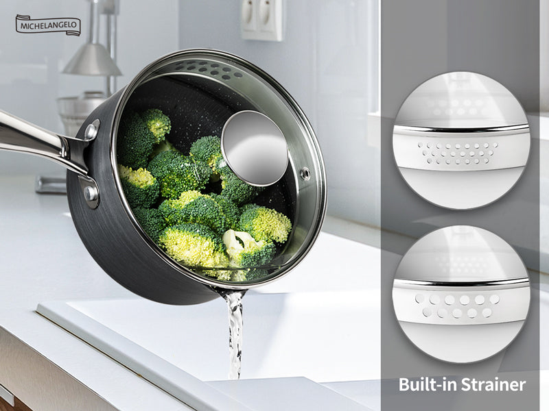 • DRAIN WATER EASILY - The saucepans in our cookware set come with strainer lids of 2 straining sizes, so you can easily strain out the water without the need for a strainer!