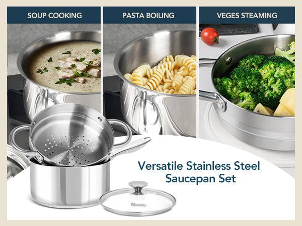 • Versatile Design: The saucepan comes with a steamer insert, making it a versatile kitchen tool. You can easily steam vegetables, seafood, and more, while also using the saucepan for regular cooking tasks like boiling, simmering, and making sauces.