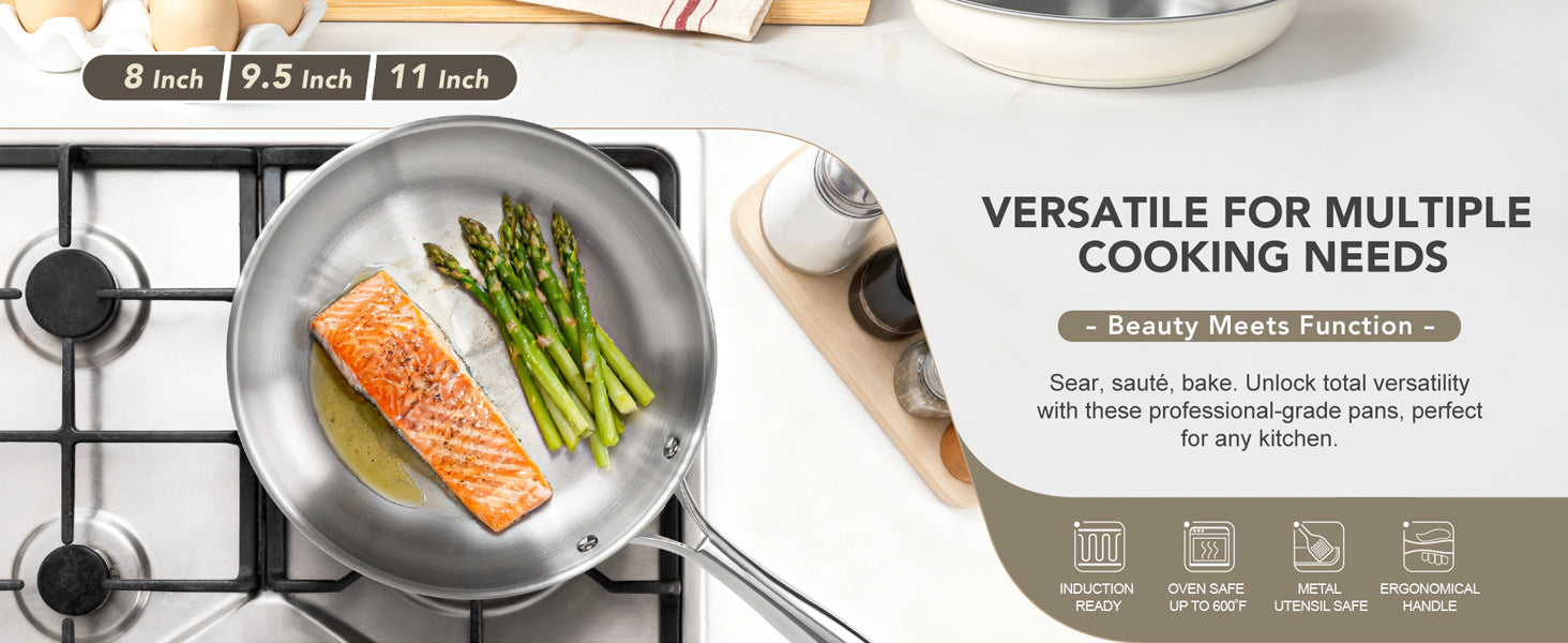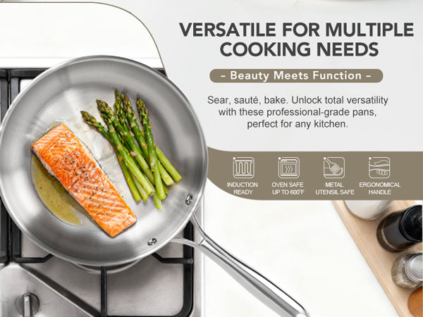 Easy Cleanup & Maintenance: For ultimate convenience, every stainless steel skillet in this collection is dishwasher-safe, making post-meal cleanup simple.