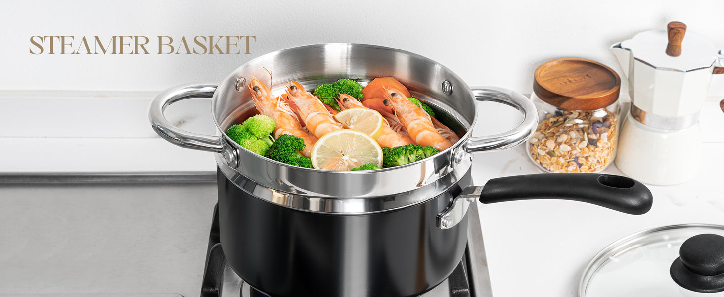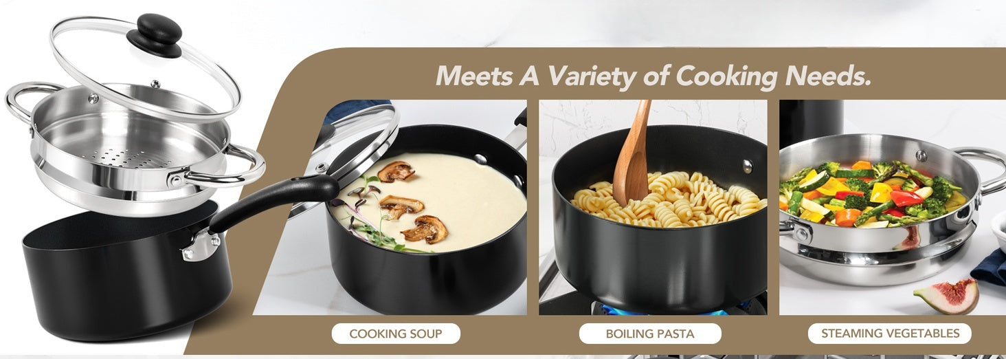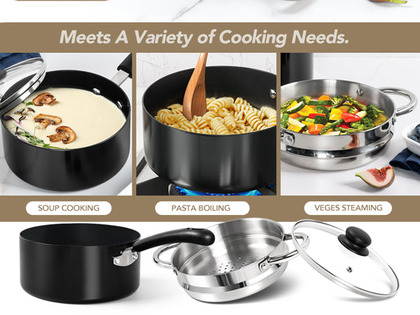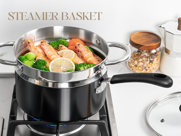 • [FAST & EVEN HEATING] - Our non stick pots have durable aluminum alloy bases that greatly enhance heating performance. Compatible with all stovetops and dishwasher-safe, the small cooking pot with steamer basket combines efficiency with convenience.
