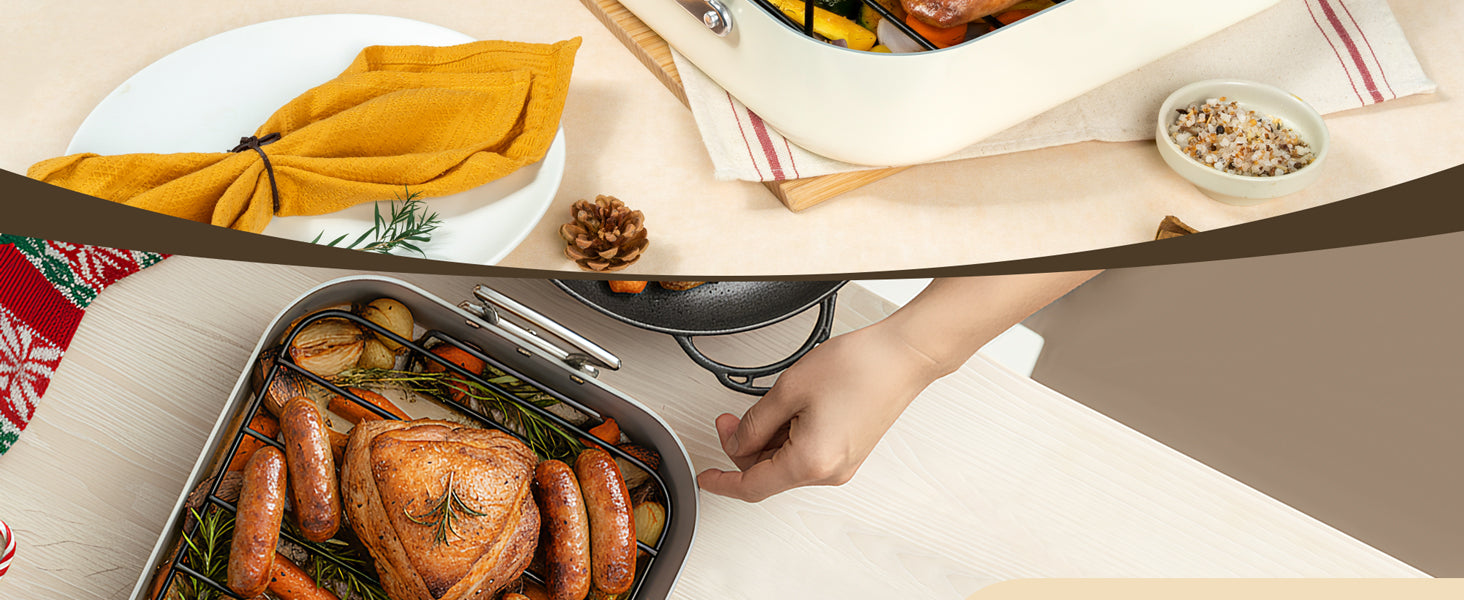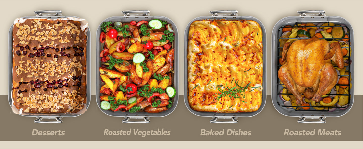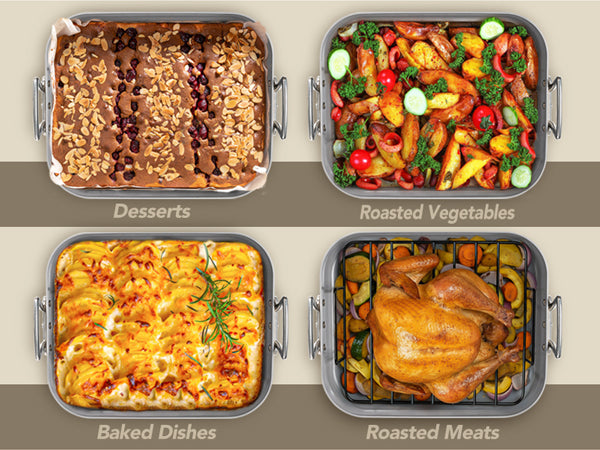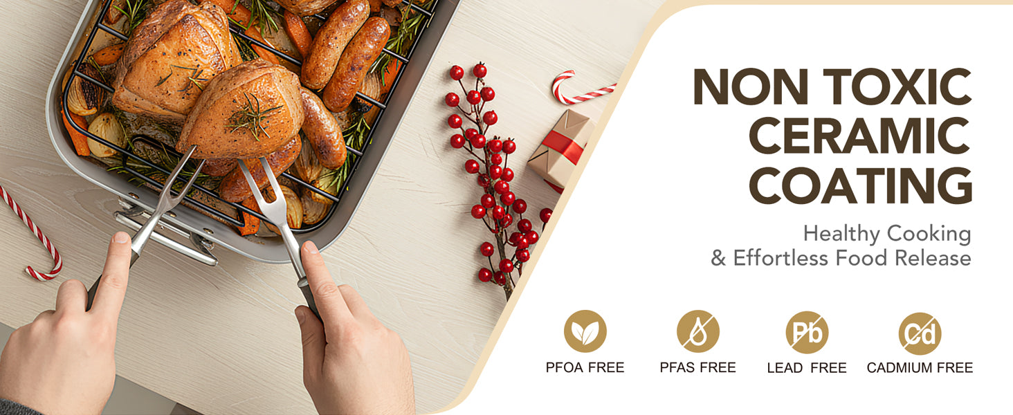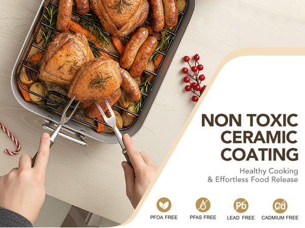 • HEALTHY & NON-TOXIC COOKING - Our ceramic roasting pan is free of PFOA and PFOS, ensuring no harmful substances are released during cooking, allowing you to prepare meals with peace of mind for your family.