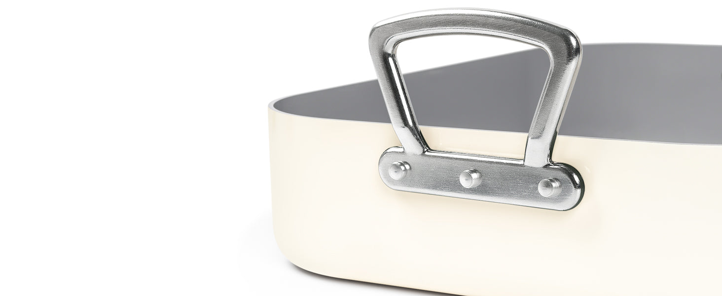 The roasting pan showcases a stunning Beige exterior, adding a touch of elegance and modern style to your kitchen. This chic color not only enhances its visual appeal but also makes it a beautiful centerpiece for serving directly from oven to table, perfect for any occasion.