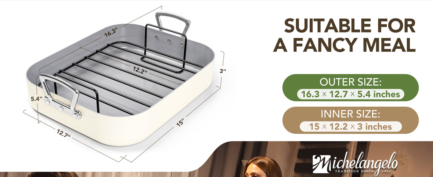 • ELEGANT DESIGN - With its sleek, modern aesthetics and elegant beige design, this roast pan complements any kitchen décor. Whether you're hosting a dinner party or preparing a casual family meal, it adds a touch of elegance to your cooking experience.