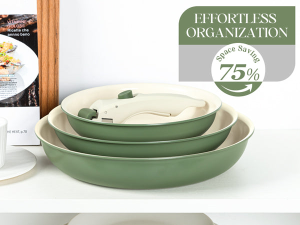 Save 75% Space: Optimize kitchen space with our space-saving design that neatly stacks all frying pans, reducing cabinet clutter by 75%. Perfect for compact kitchens or ideal for campers, this 3-piece frying pan set keeps your kitchen organized and tidy without compromising on functionality.