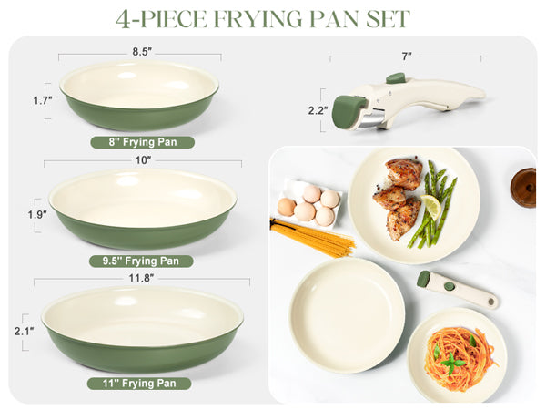 Versatile All-In-One Set: Transform your kitchen with this all-encompassing skillet set, featuring an 8" frying pan, 9.5" frying pan, 11" frying pan, and 1*removable handle. Designed for seamless compatibility, guaranteeing a comprehensive and adaptable cooking experience.