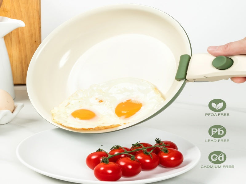 Healthy Granite Nonstick Coating: Prioritize your family's well-being with our 3 pcs fry pan set featuring a natural granite non-stick material. Free from Teflon, PTFE, PFAS, and harmful chemicals. The scratch-resistant, stain-resistant, and durable granite coating of removable handle frying pan set maintains an appealing beige appearance even after extended use.