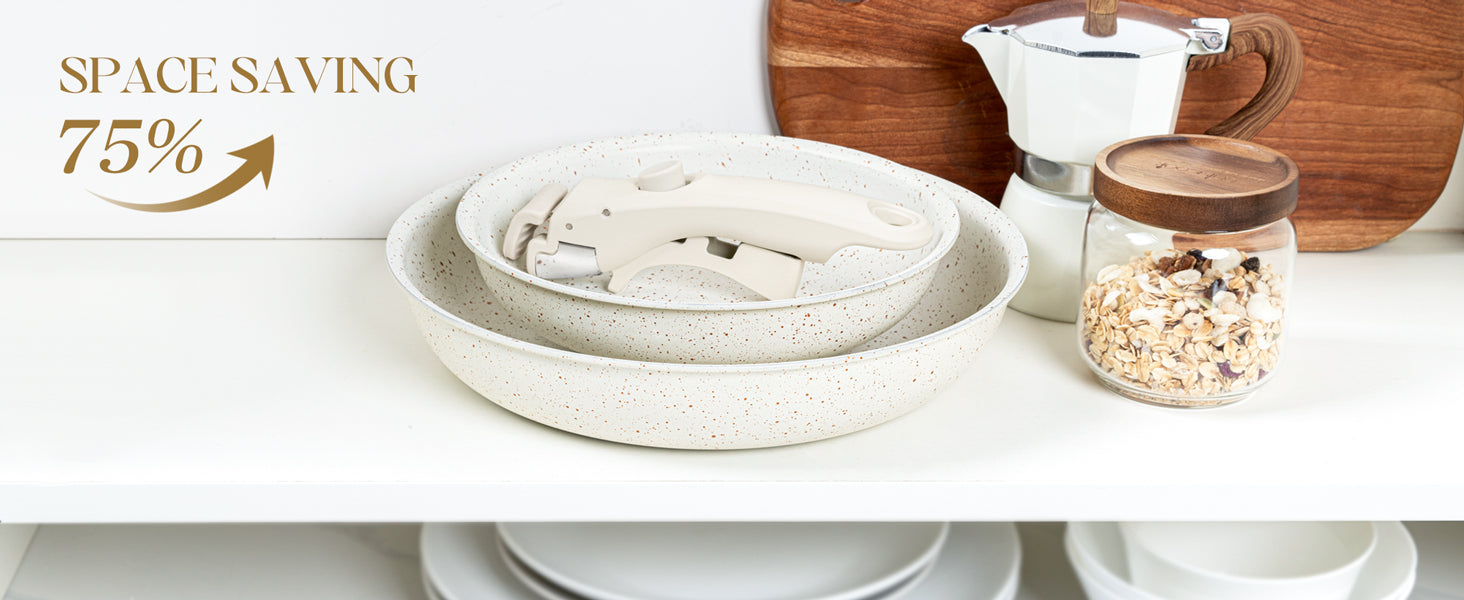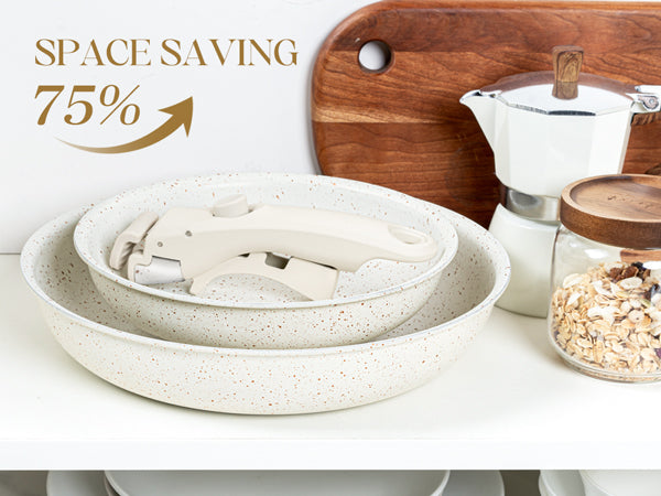 Save 75% Space: Optimize kitchen space with our space-saving design that neatly stacks all frying pans, reducing cabinet clutter by 75%. Perfect for compact kitchens or ideal for campers, this 2-piece frying pan set keeps your kitchen organized and tidy without compromising on functionality.