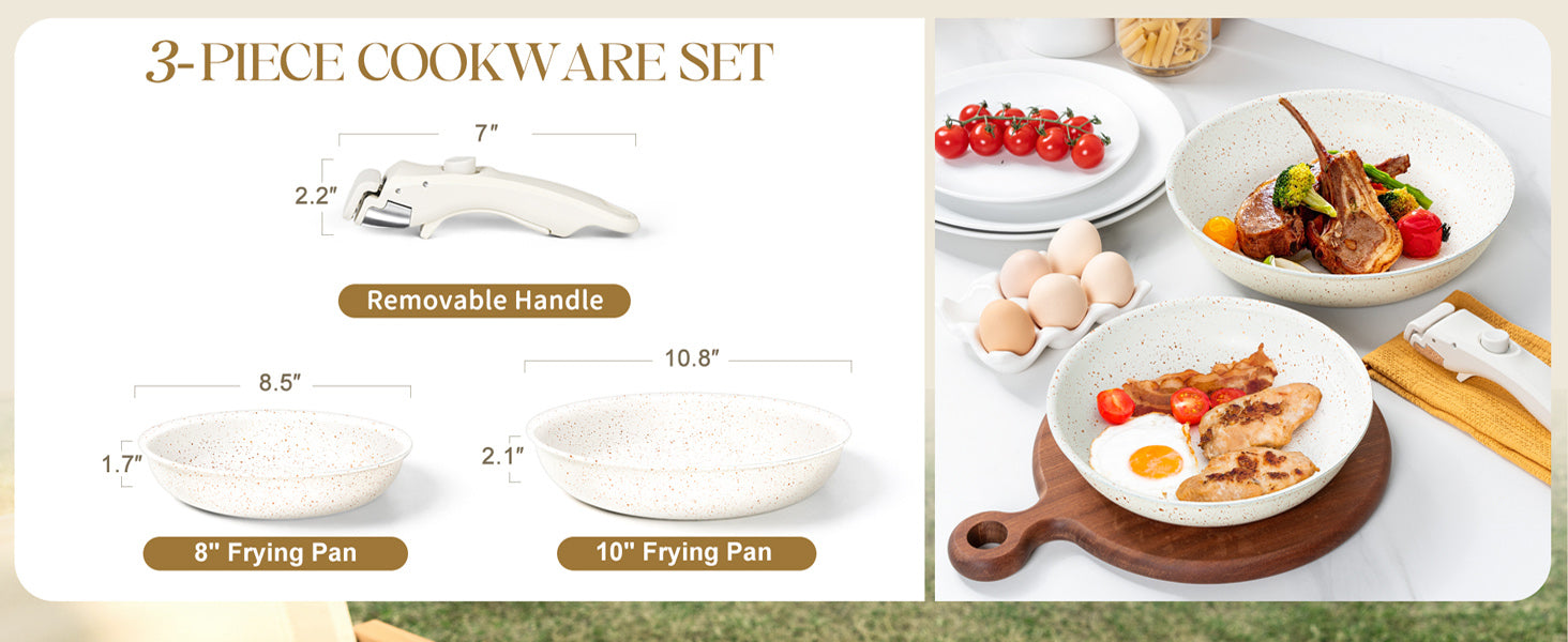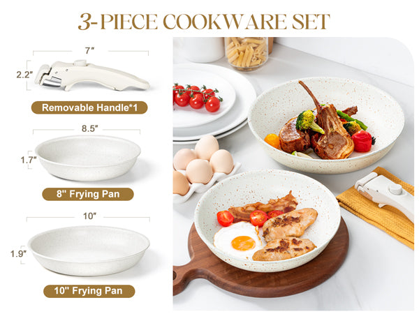 Versatile All-In-One Set: Transform your kitchen with this all-encompassing skillet set, featuring an 8" frying pan, 10" frying pan, and 1*removable handle. Designed for seamless compatibility, guaranteeing a comprehensive and adaptable cooking experience.