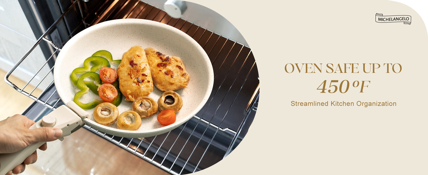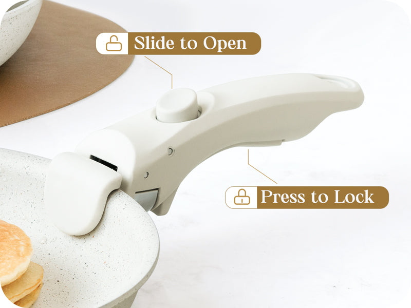 Convenience with Detachable Handle: Effortlessly switch your frying pan between stovetop, oven, table, and fridge by simply pushing back the detachable handle. This versatile feature enhances the overall convenience, making your skillet set effortlessly adaptable to various cooking and serving needs.