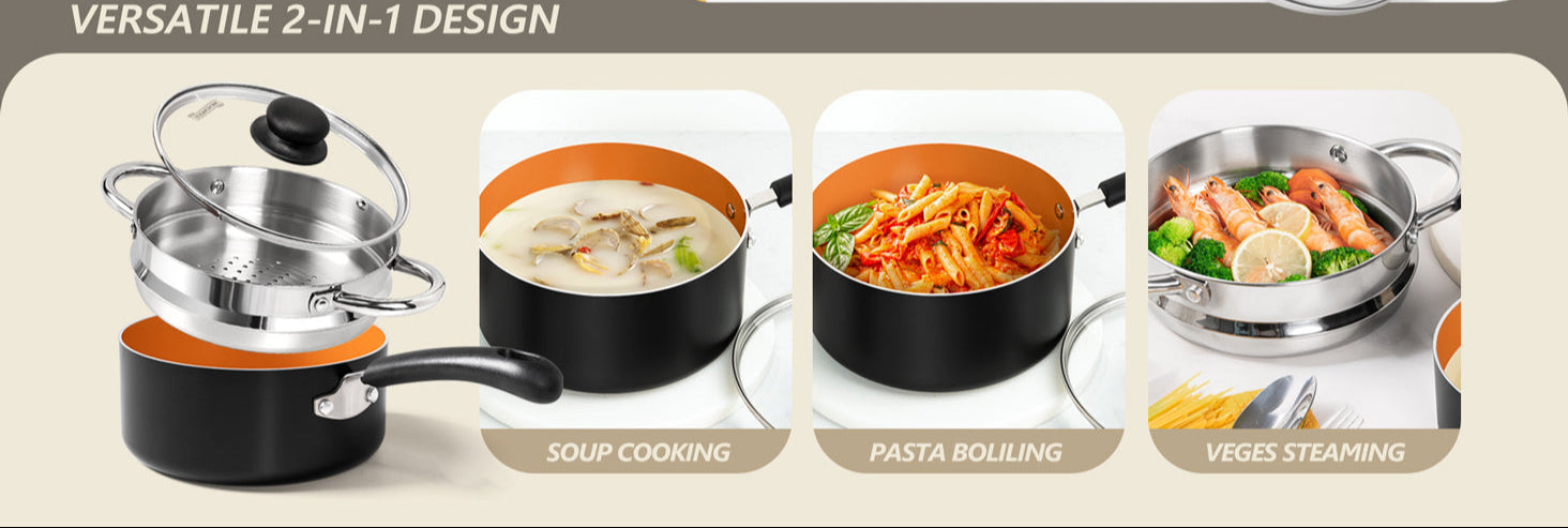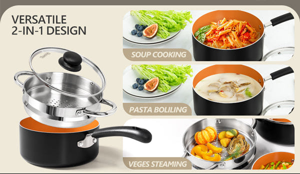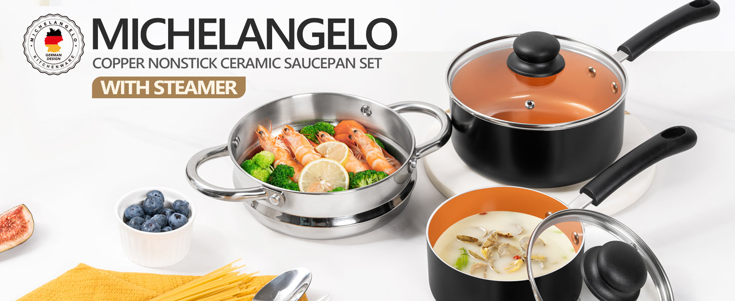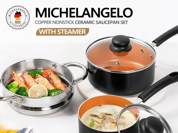 MICHELANGELO Nonstick Sauce Pan with Lid, 1QT & 2QT Ceramic Saucepan with 2QT Steamer