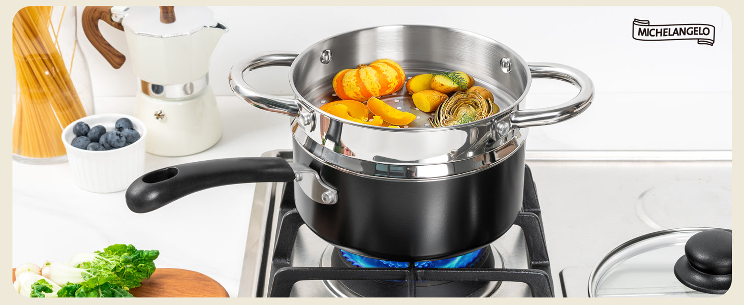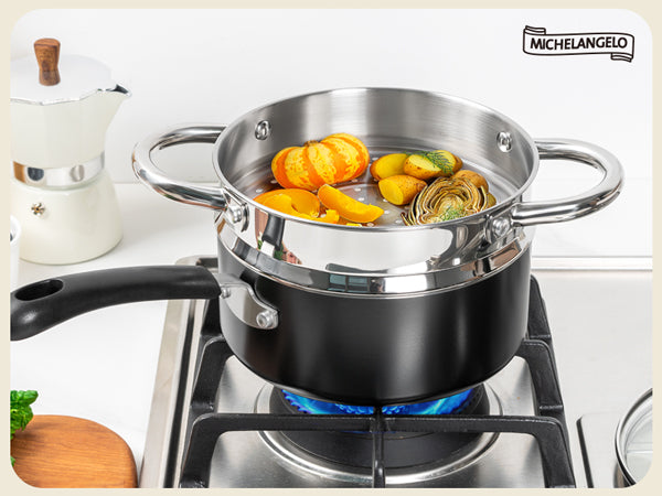 MICHELANGELO nonstick sauce pan crafted from 304 stainless steel, this steamer features dual side handles for easy and safe lifting.