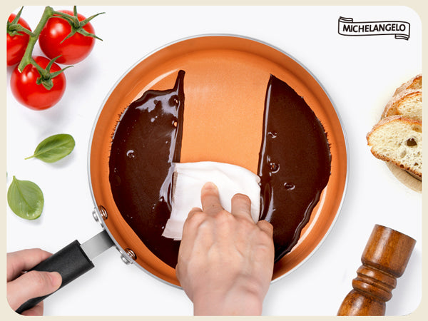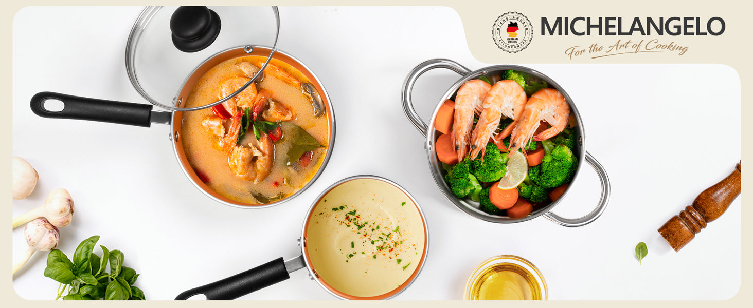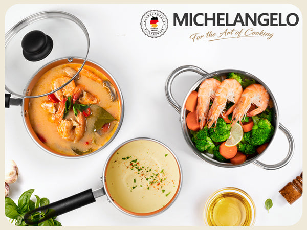 MICHELANGELO Small Copper Saucepans Set made with aluminum body provides fast, even heating for reliable, consistent results and energy-efficient cooking.