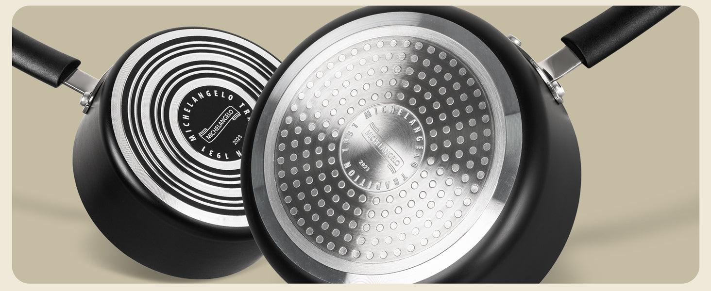 MICHELANGELO sauce pan set features durable aluminum alloy bases for fast, even heat distribution, ensuring consistent cooking results. The sturdy design enhances heating performance, making it ideal for all stovetops.