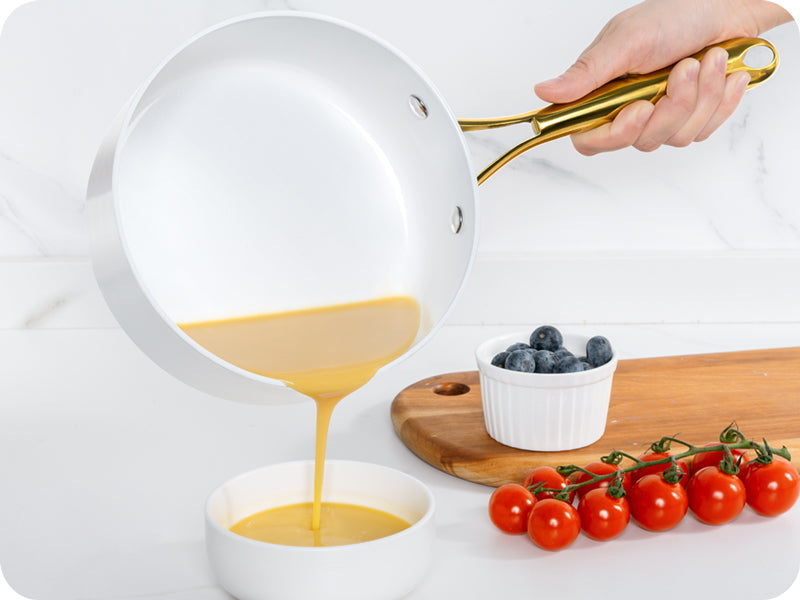 For better nonstick performance and healthier cooking results, our sauce pan is coated with a professional-grade, PFOA-free ceramic coating.
