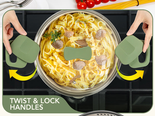 • Easy Draining - Our pasta pot with built-in strainer lid drains spaghetti/pasta instantly through tempered glass lid’s holes. No extra colander. Rotating handles lock securely for spill-free pouring.