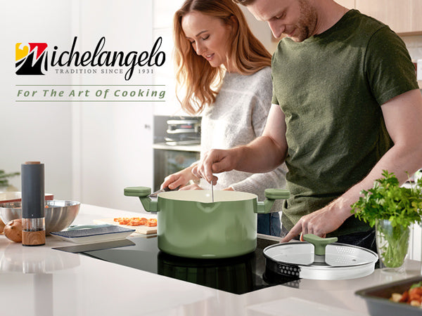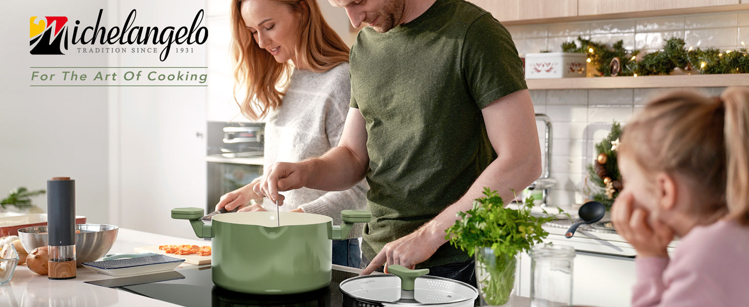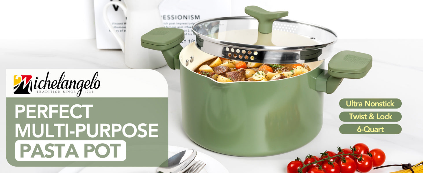 MICHELANGELO Pasta Pot with Strainer Lid- 6 Quart Non Stick Cooking Pot Roden Green