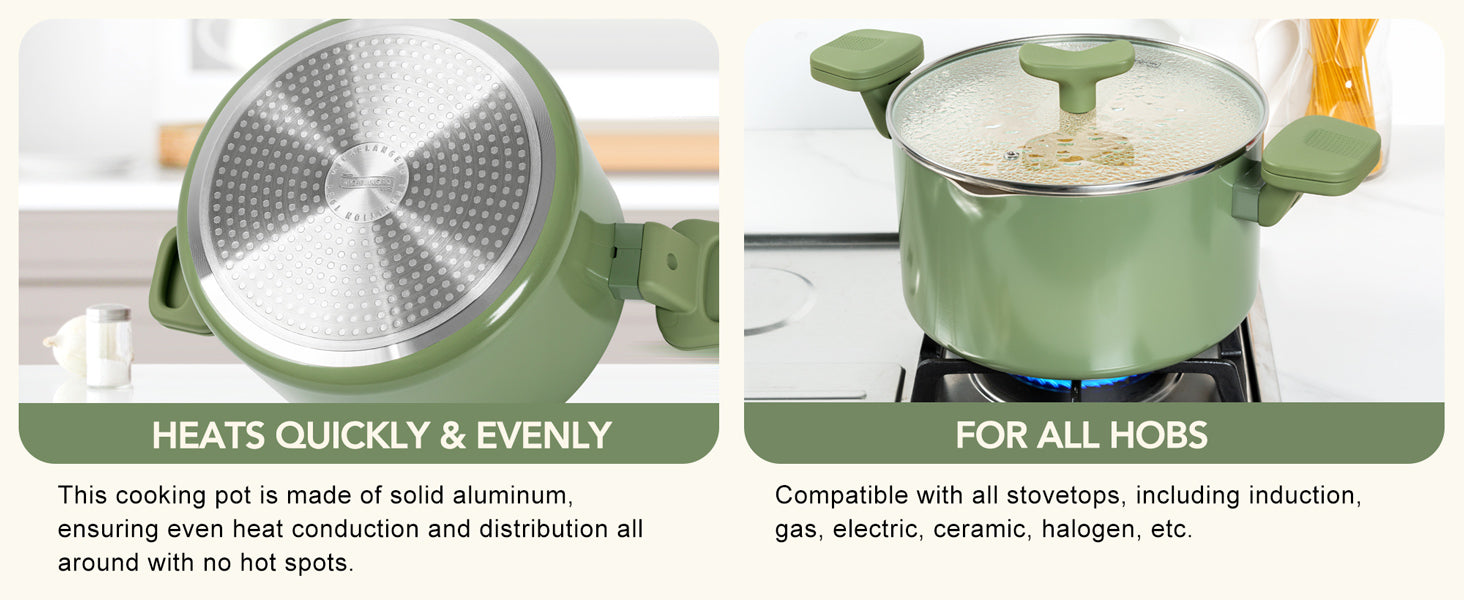 • Rapid-Heat Aluminum Spaghetti Pot – 6-quart aluminum body & alloy base heats 30% faster on induction/gas/electric stoves. Boil 1lb pasta in minutes.