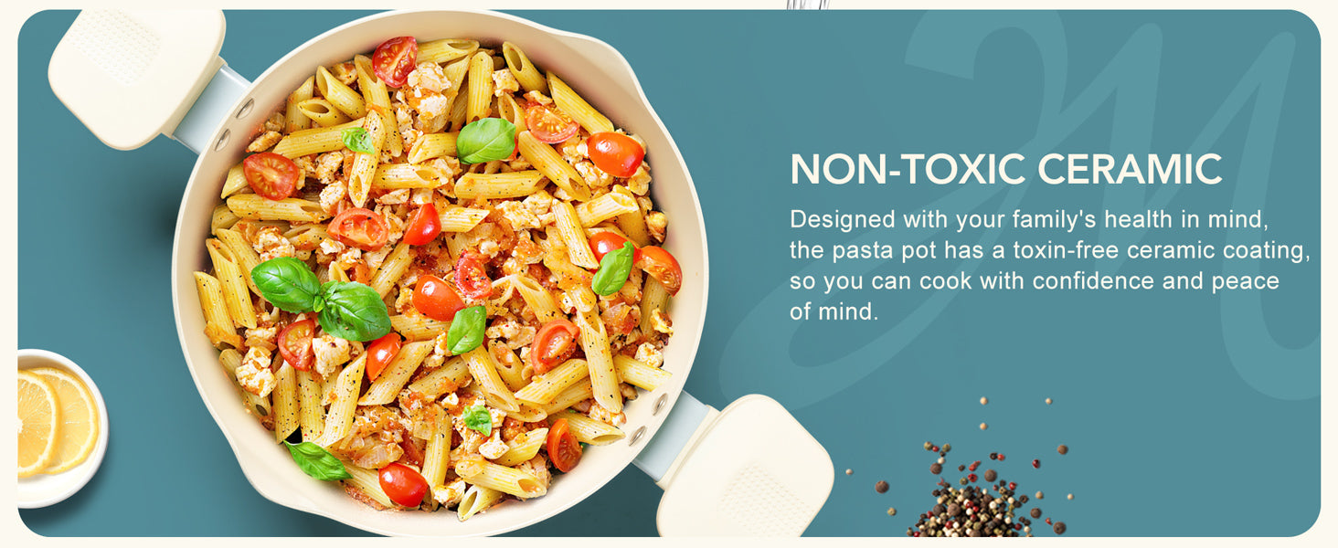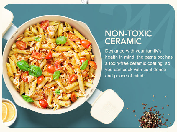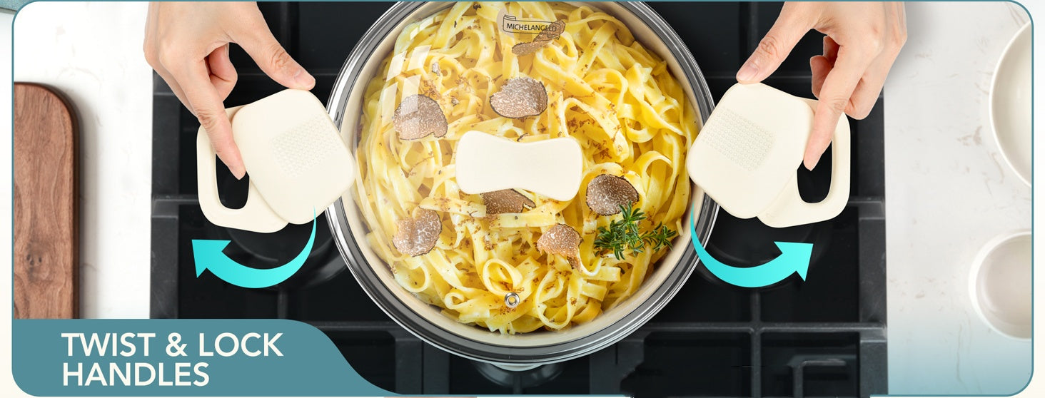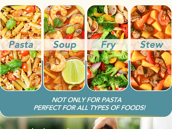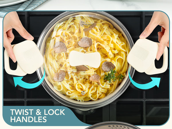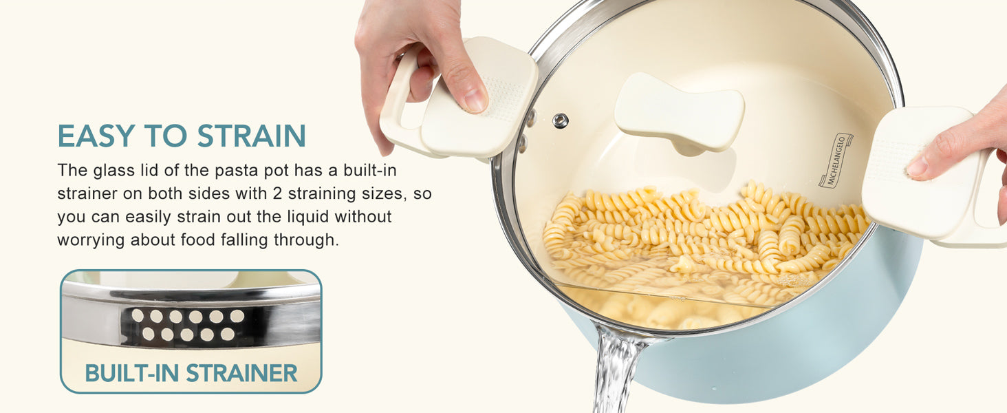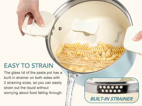 Easy Draining - Our pasta pot with built-in strainer lid drains spaghetti/pasta instantly through tempered glass lid’s holes. No extra colander. Rotating handles lock securely for spill-free pouring.