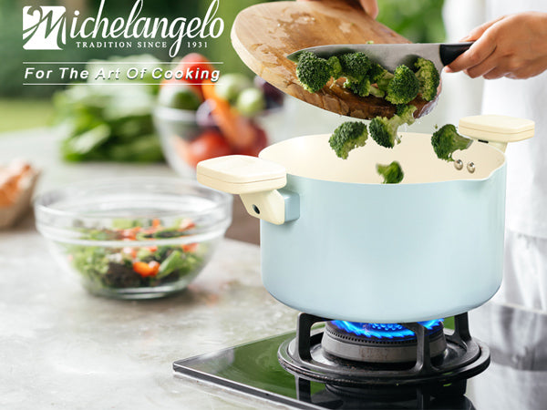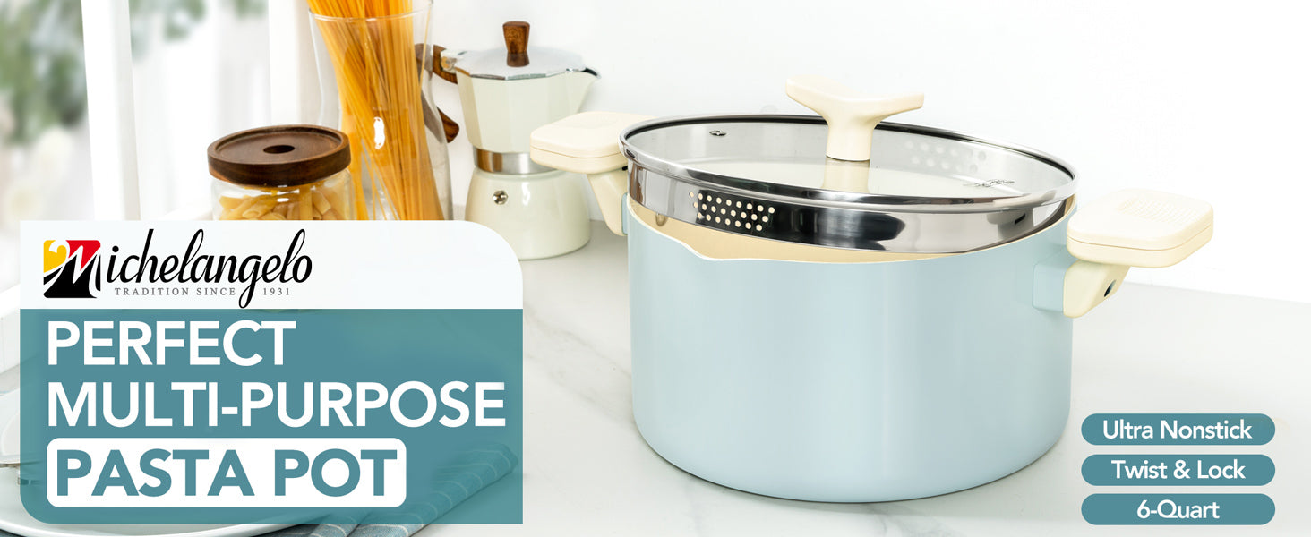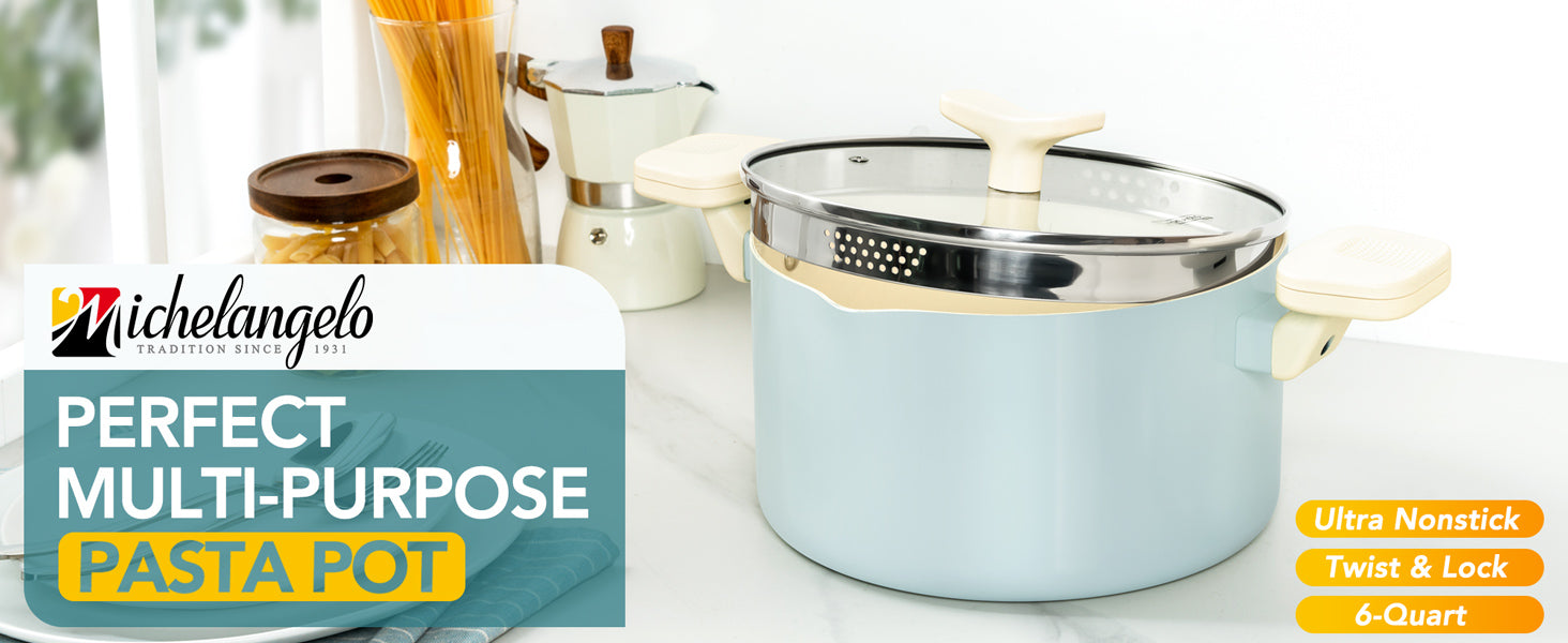 MICHELANGELO Pasta Pot with Strainer Lid- 6 Quart Non Stick Cooking Pot Soft Aqua