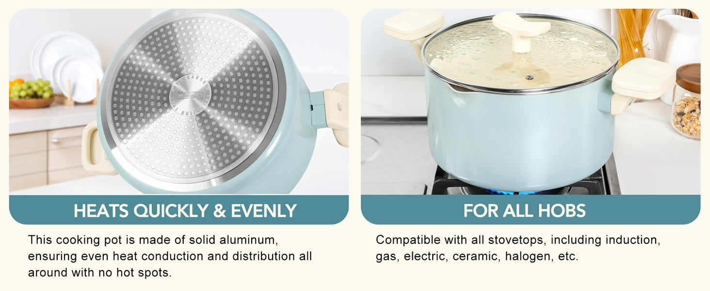 Rapid-Heat Aluminum Spaghetti Pot – 6-quart aluminum body & alloy base heats 30% faster on induction/gas/electric stoves. Boil 1lb pasta in minutes.