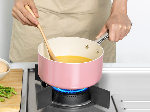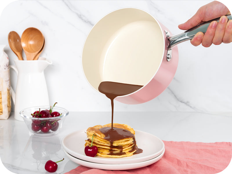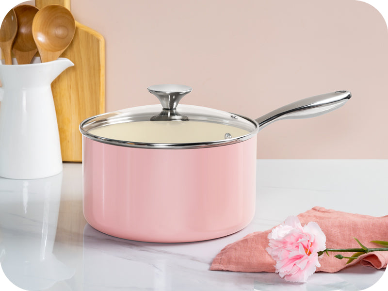 For better nonstick performance and healthier cooking results, our saucepans are coated with a professional-grade, PFOA-free ceramic coating. This set of saucepans will make your daily cooking greener and safer!