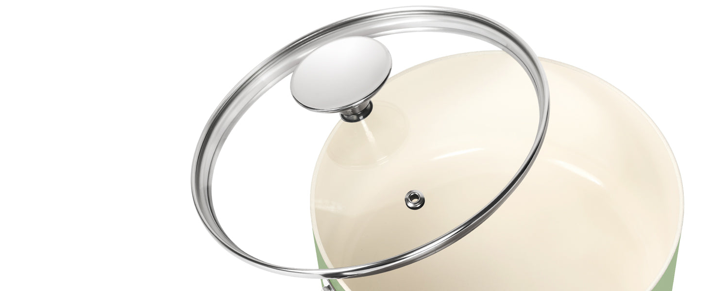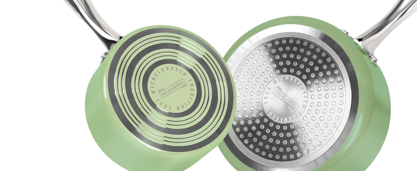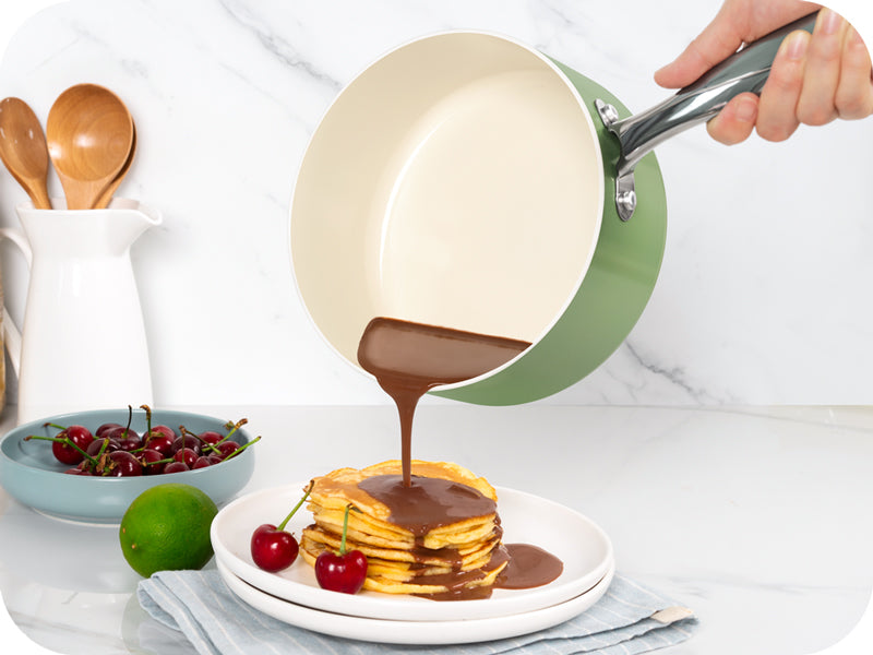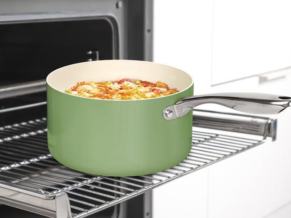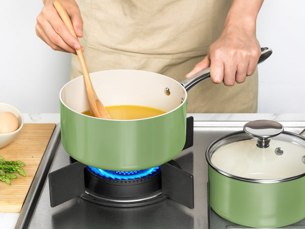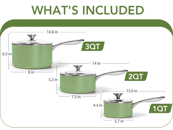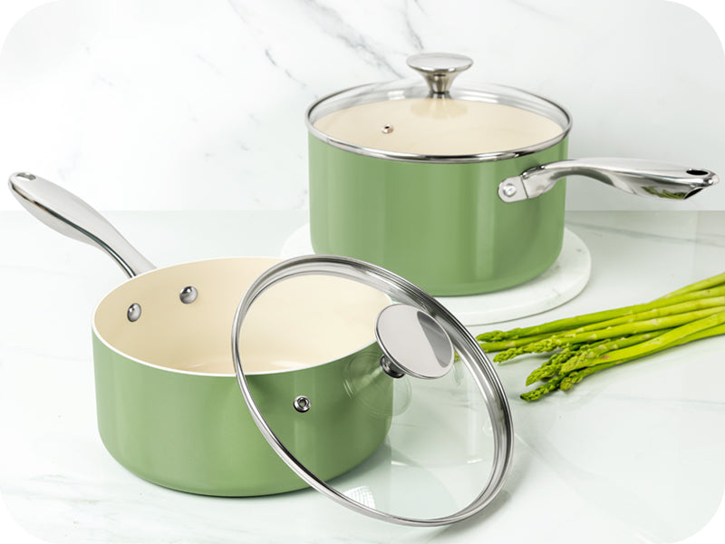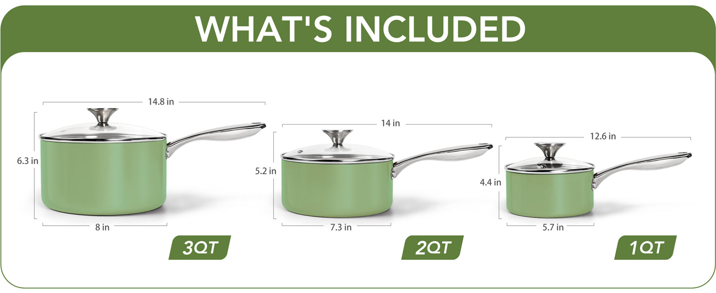 For better nonstick performance and healthier cooking results, our saucepans are coated with a professional-grade, PFOA-free ceramic coating. This set of saucepans will make your daily cooking greener and safer!