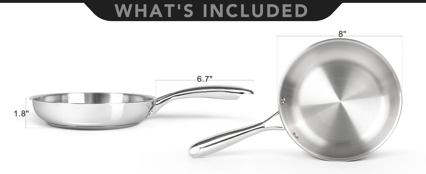 Durable Construction: Crafted from high-quality 18/10 stainless steel, this 8 inch pan is built to last. Resistant to rust and corrosion, these pans ensure long-term performance for all your cooking needs.