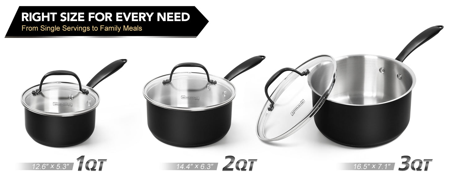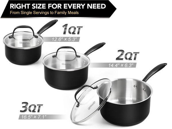 • Versatile Size Options - This saucepan with lid set includes 1qt, 2qt, and 3 qt saucepan with lid sizes, ideal for boiling, simmering, or preparing sauces for any meal.