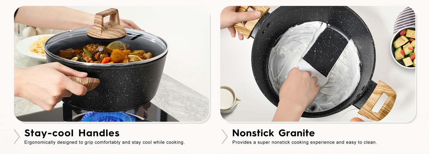 For better nonstick performance and healthier cooking results, our cooking pot is coated with a professional-grade, PFOA-free granite coating. This nonstick pot will make your daily cooking greener and safer!