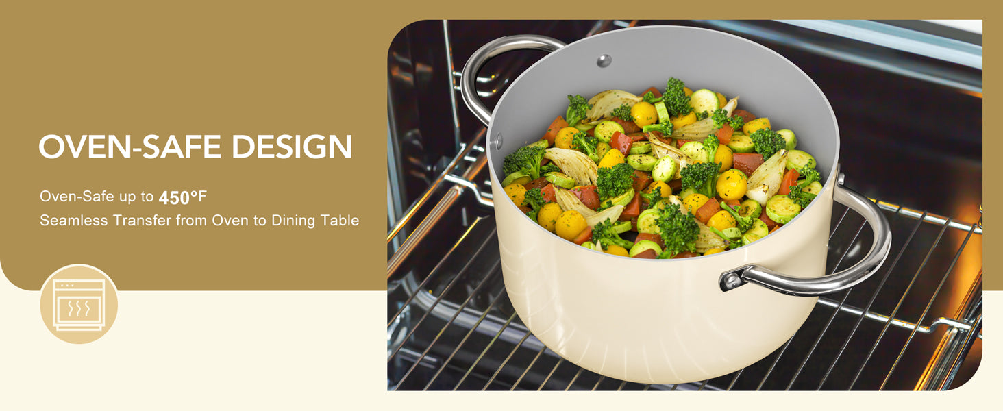 • Even Heat Distribution: The aluminum body provides superior heat conductivity, while the tri-ply bottom distributes heat quickly and evenly for enhanced flavor and texture. This nonstick pot is oven-safe up to 450°F for versatile stovetop-to-oven cooking.