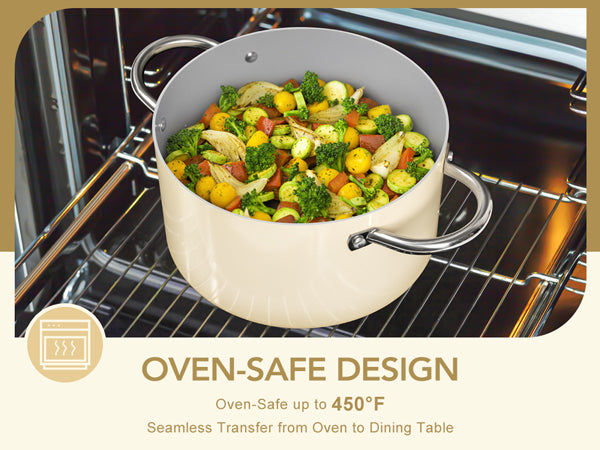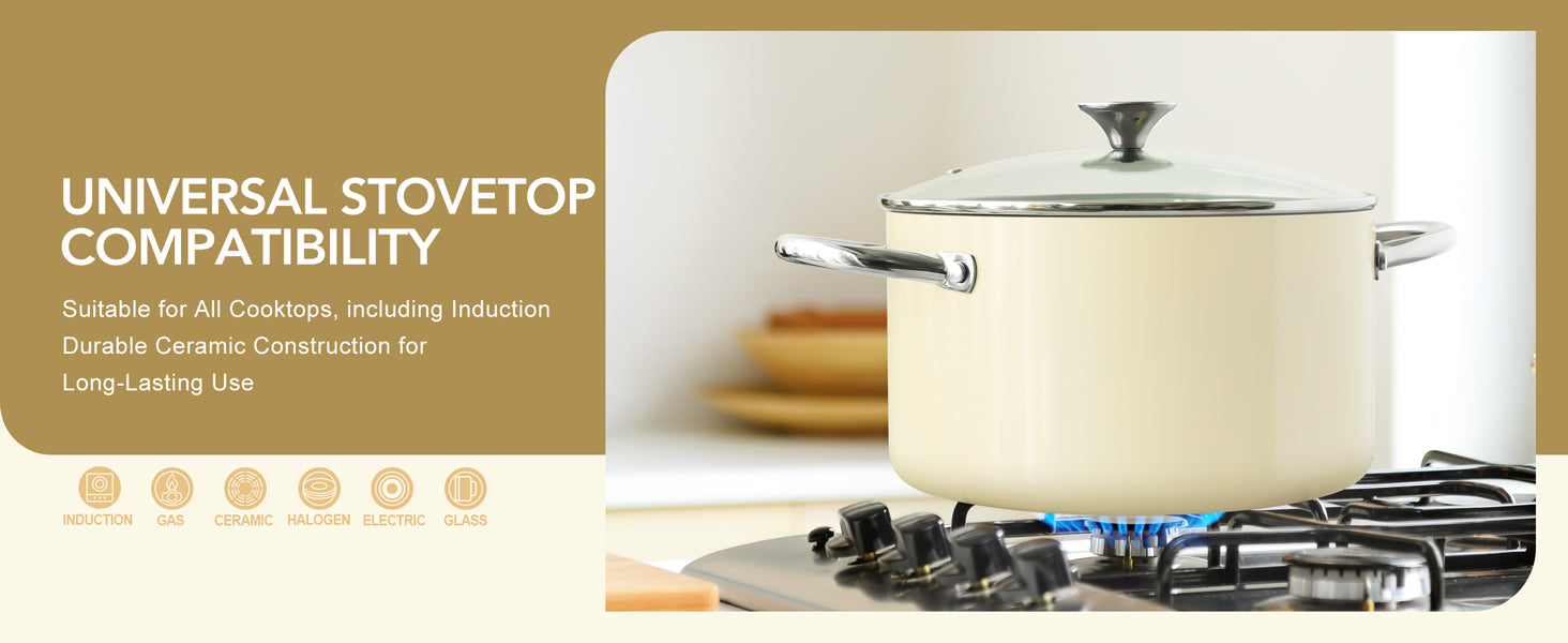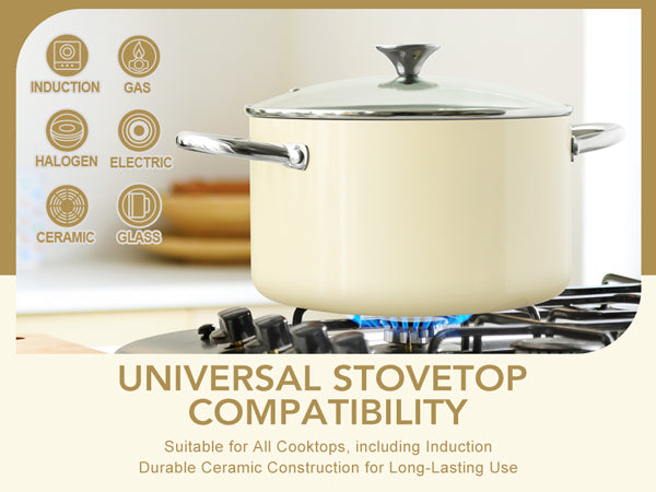 • Versatile Usage: Available in 5qt and 6qt sizes, the ceramic pot is suitable for various cooking needs and methods, including boiling, stewing, simmering, and sautéing. It is also compatible with all stovetops including induction.