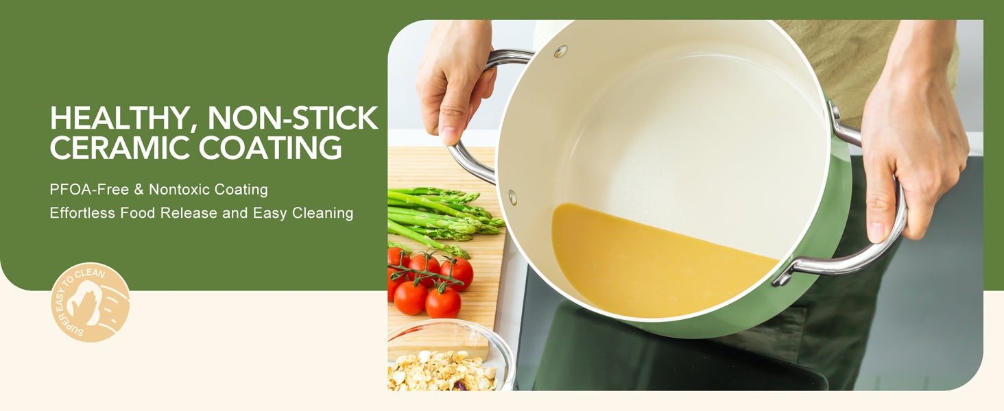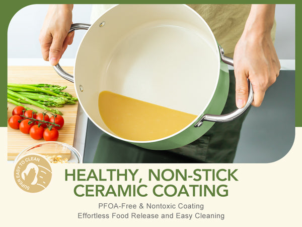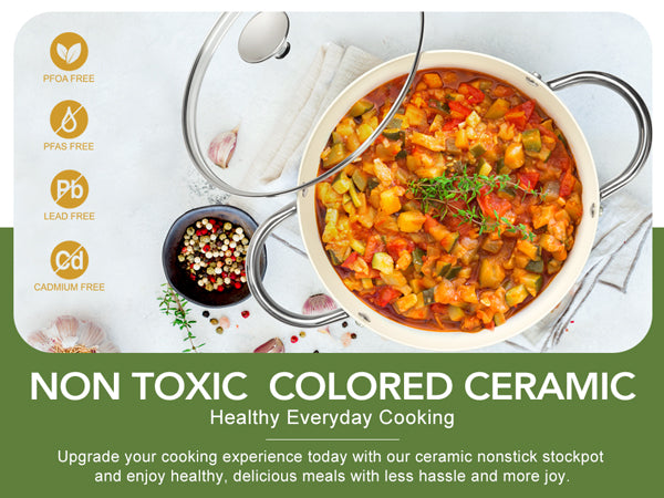 • Healthy & Non-Toxic Cooking: Our ceramic-coated stockpot is free of PFOA and PFOS, ensuring no harmful substances are released during cooking, allowing you to prepare meals with peace of mind for your family.