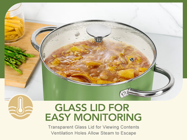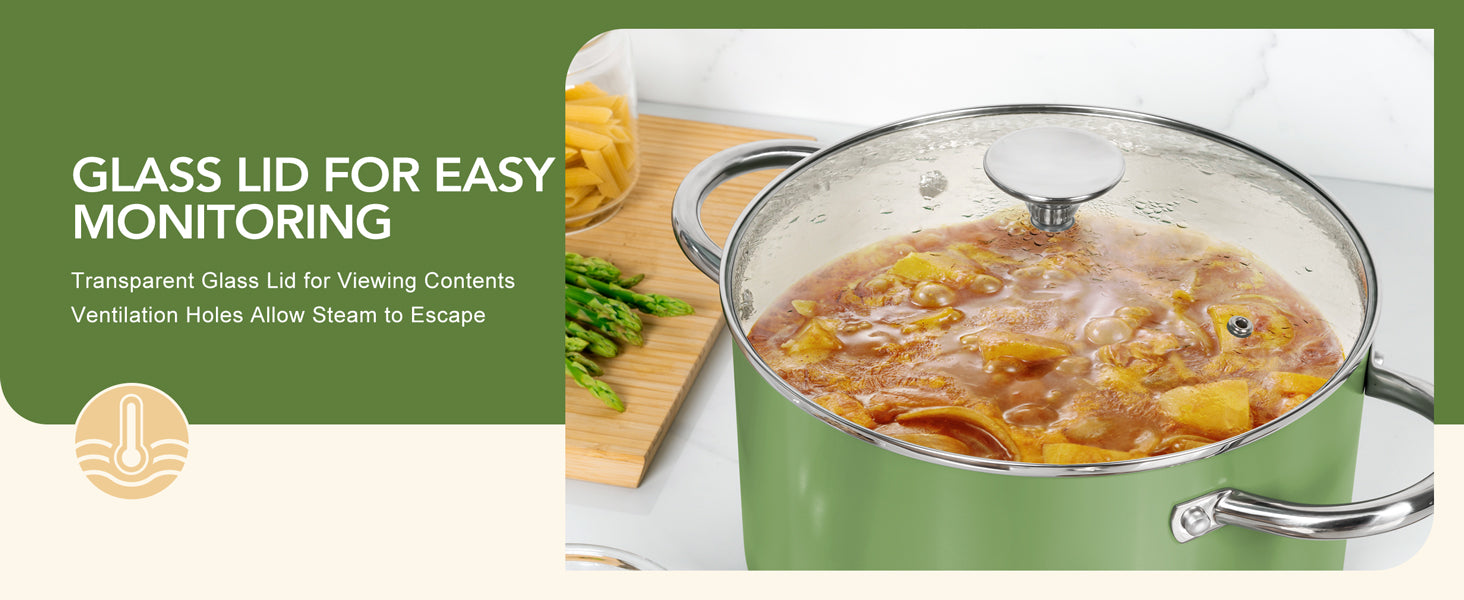 • Convenient Glass Lid: The tempered glass lid is heat-resistant and impact-resistant for safe cooking. The clear design allows you to monitor food without lifting the lid, preventing heat loss and ensuring nutrients are retained.