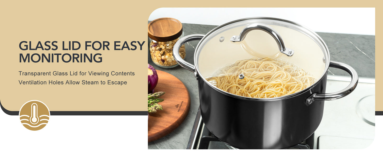 For better nonstick performance and healthier cooking results, our stock pot are coated features a high-performance & toxin-free nonstick coating, making the pots easy to clean and use.