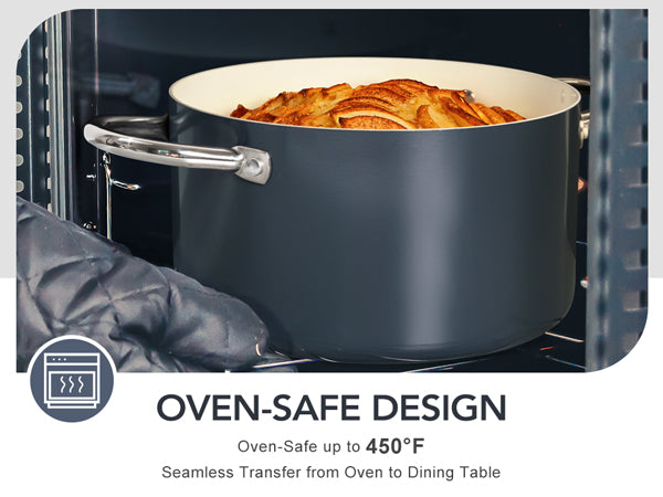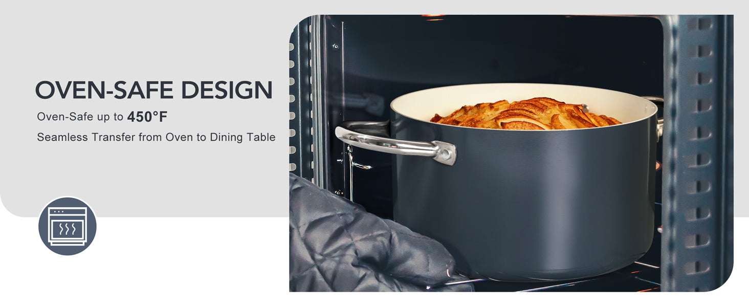 Even Heat Distribution: The aluminum body provides superior heat conductivity, while the tri-ply bottom distributes heat quickly and evenly for enhanced flavor and texture. This ceramic pot is oven-safe up to 450°F for versatile stovetop-to-oven cooking.